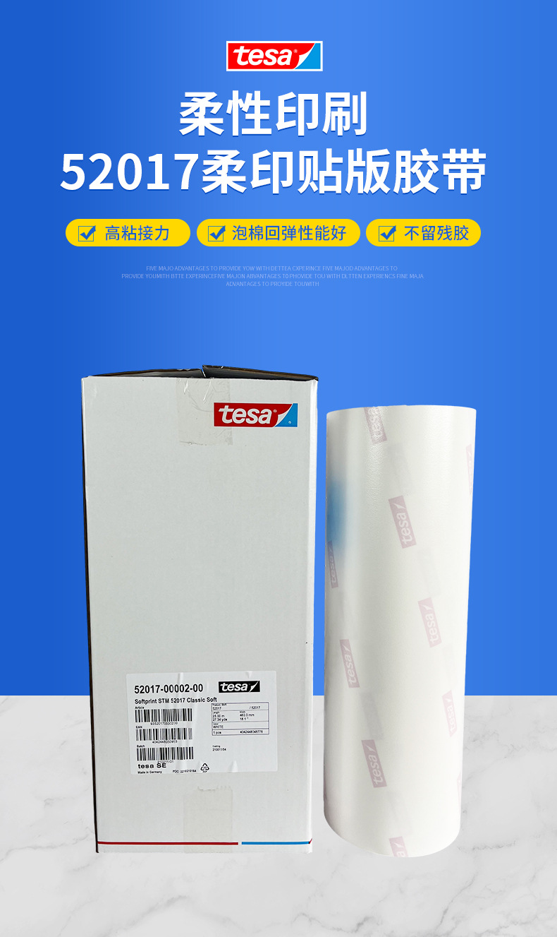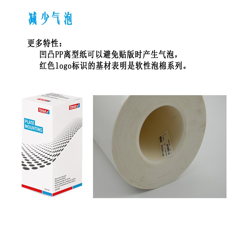 双面泡棉胶带,专门设计用于柔版标签印刷中粘贴厚度为1.70mm (0.067") 或者2.54mm (0.100") 的感光树脂版主要应用于窄幅标签柔版印刷机52017软性泡棉是组合印刷及网点印刷的理想解决方案